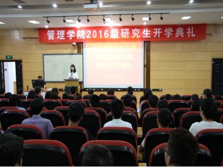 金秋送爽,丹桂飘香,西安建筑科技大学管理学院2016级研究生开学典礼在我校雁塔校区图书馆二楼报告厅隆重举行。管理学院党委书记高瑞龙老师,院长王成军老师,副院长卢才武老师,党委副书记、副院长蒋小侠老师,副院长郭斌老师,副院长唐晓灵老师等出席会议,管理学院各系主任、系党支部书记、行政办公室、学生工作办公室等办公室负责老师及全体2016级研究生参加了开学典礼。典礼由研究生辅导员张紫薇老师主持。