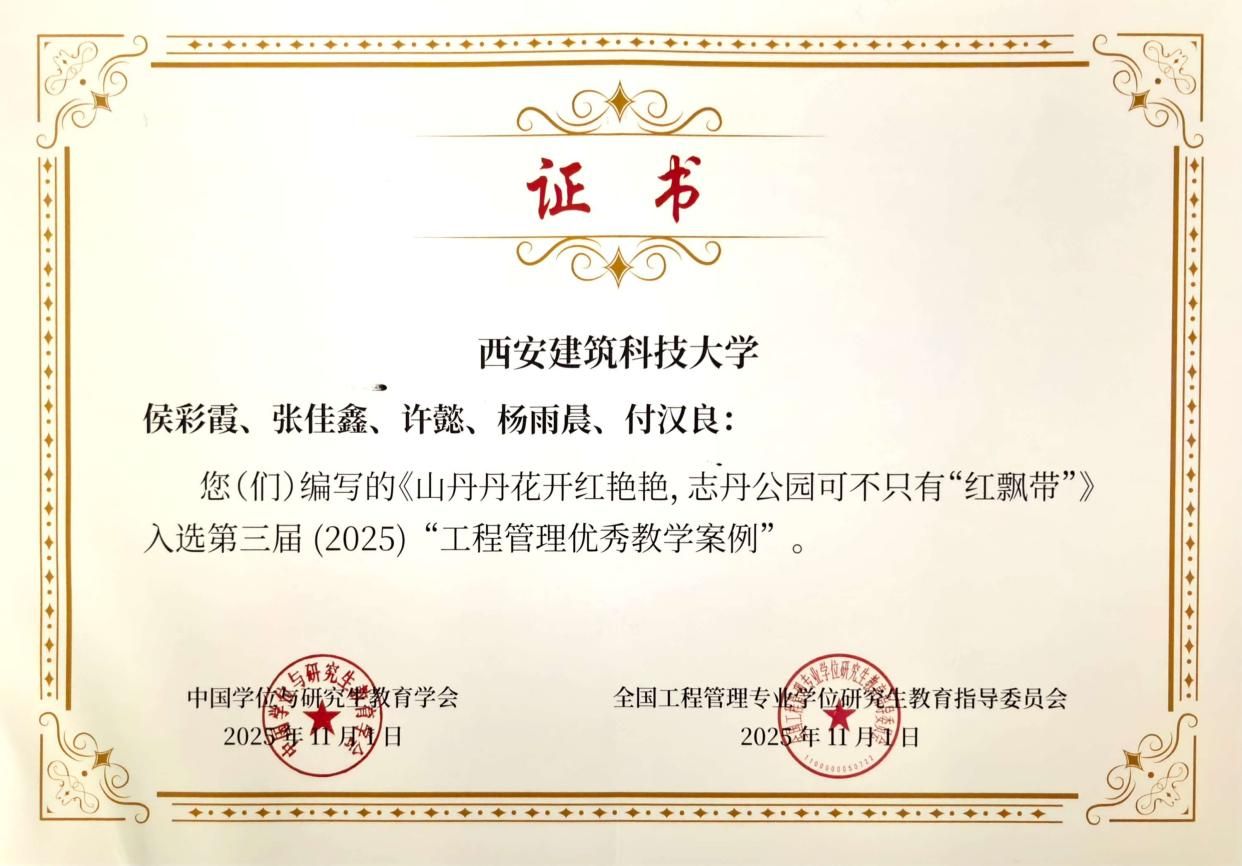 2025年11月1日下午,第四届工程管理案例大赛决赛暨第三届“工程管理优秀教学案例”颁奖仪式在北京理工大学良乡校区隆重举行。本次大赛共吸引全国百余所高校团队参赛,经多轮评审最终评选出30个优秀案例。由我院教师侯彩霞、付汉良,研究生张佳鑫、杨雨晨,西安建筑科技大学设计研究总院有限公司建筑设计院副院长许懿组成的团队共同完成的案例“山丹丹花开红艳艳,志丹公园可不只有红飘带”荣获第三届“工程管理优秀教学案例”。至此,我院老师指导完成的教学案例已连续两年入选工程管理优秀教学案例,彰显了我院在工程管理领域的雄厚实力。